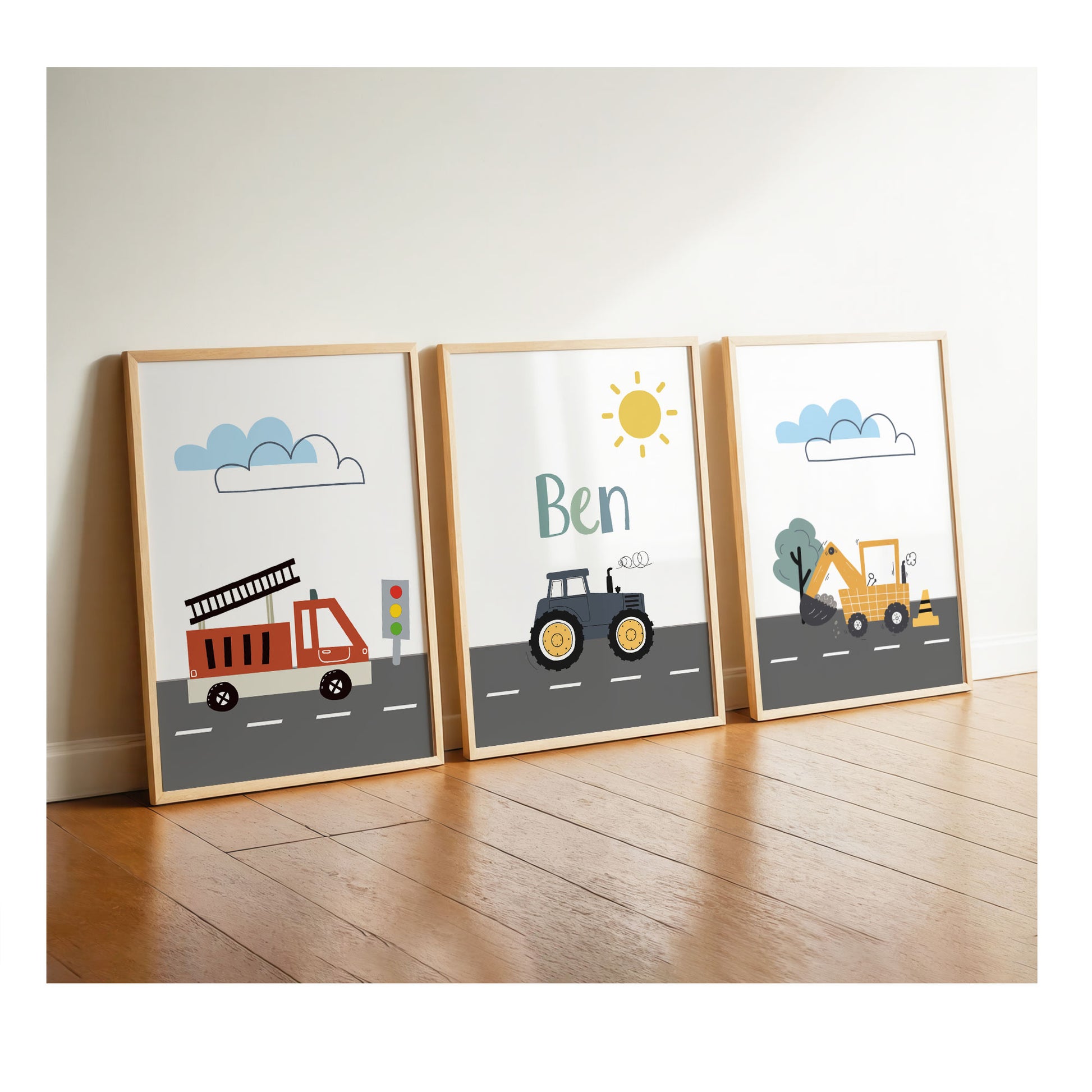 This set of three posters featuring a fire truck (or cement mixer), a tractor with a sun, and an excavator will brighten up any nursery, baby's room, boy's room, or playroom! These wall art prints are not only suitable as Scandinavian-style wall decorations, but also make a great gift for toddlers, children, and for christenings or birthdays (e.g., first birthdays).