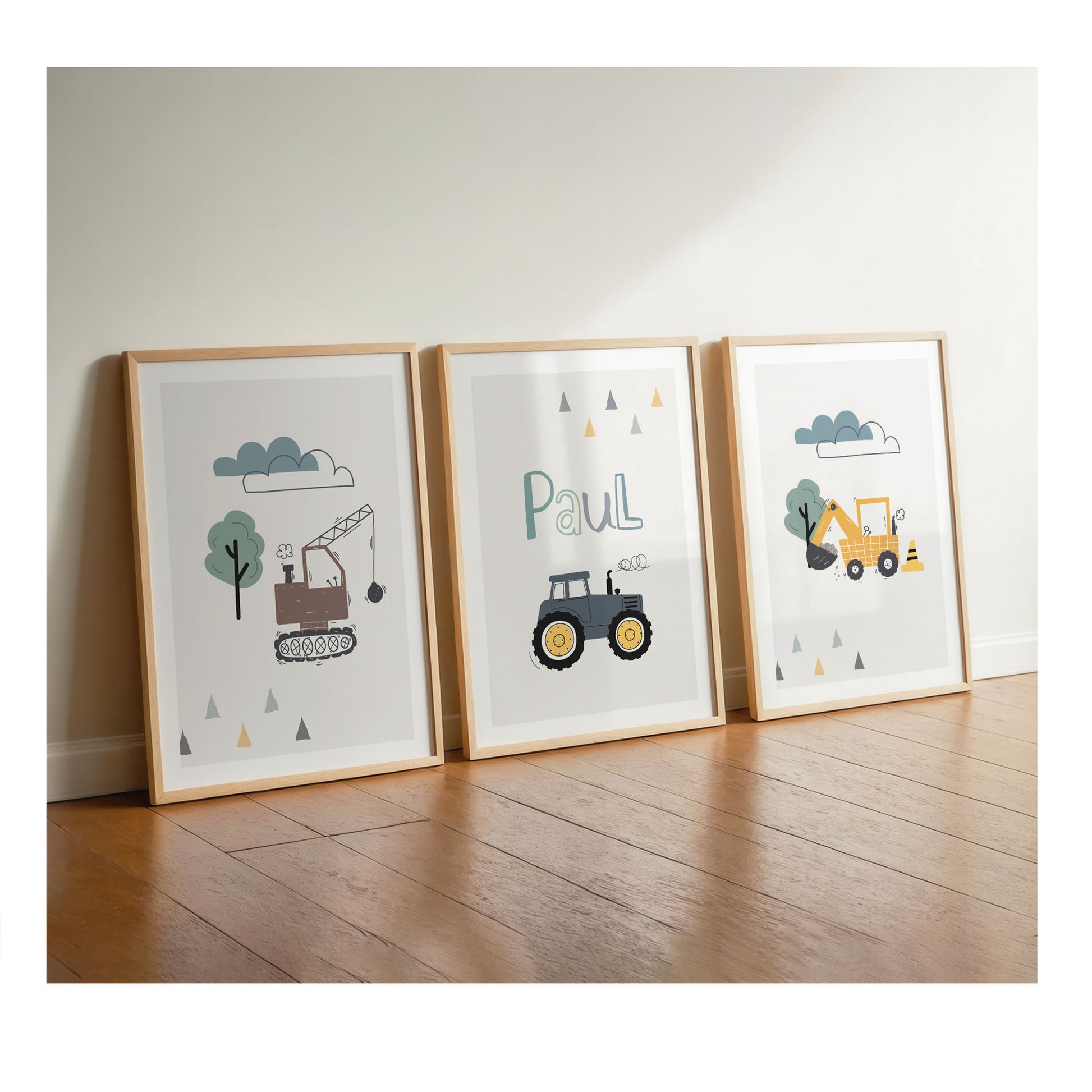 Children's room poster set for boys as a beige, white or grey wall decoration in the children's room or baby room with the popular vehicles: tractor, excavator & wrecking ball.