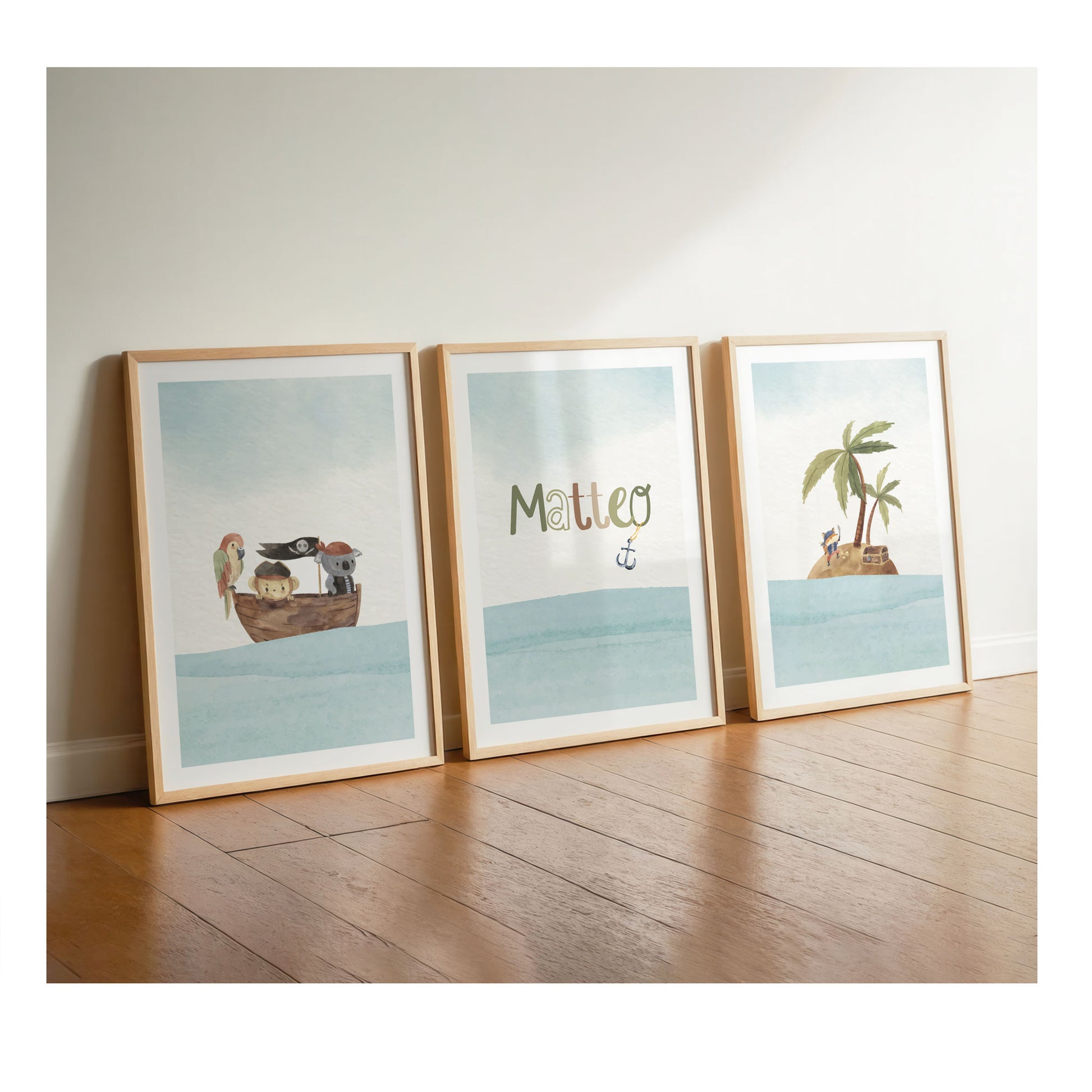 Nautical poster set with cute pirate animals on a treasure hunt. This nursery decor featuring a fox, monkey, koala, and parrot on a boat at sea is not only suitable as a wall decoration in a child's room or baby's room, but also as a gift for children, boys, and pirate fans.