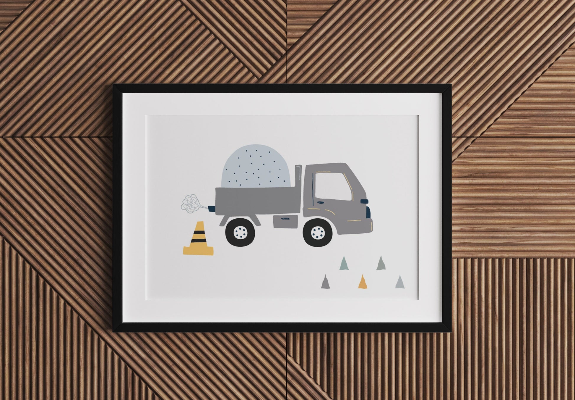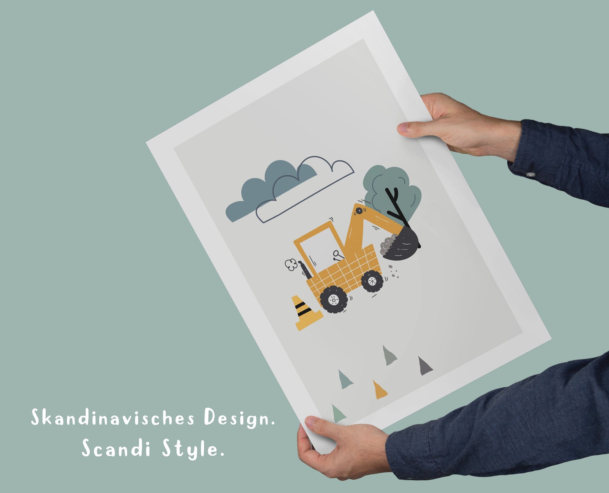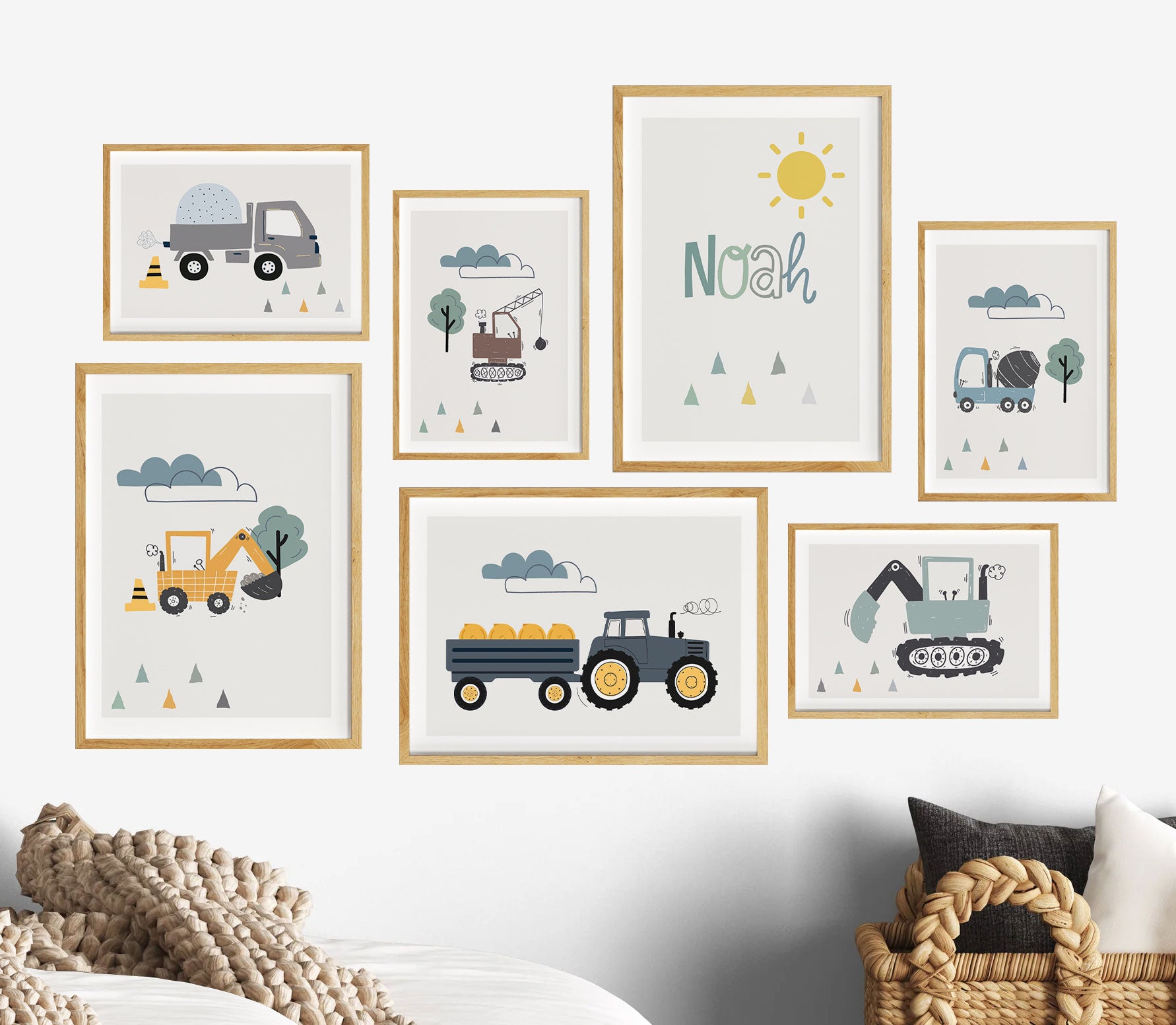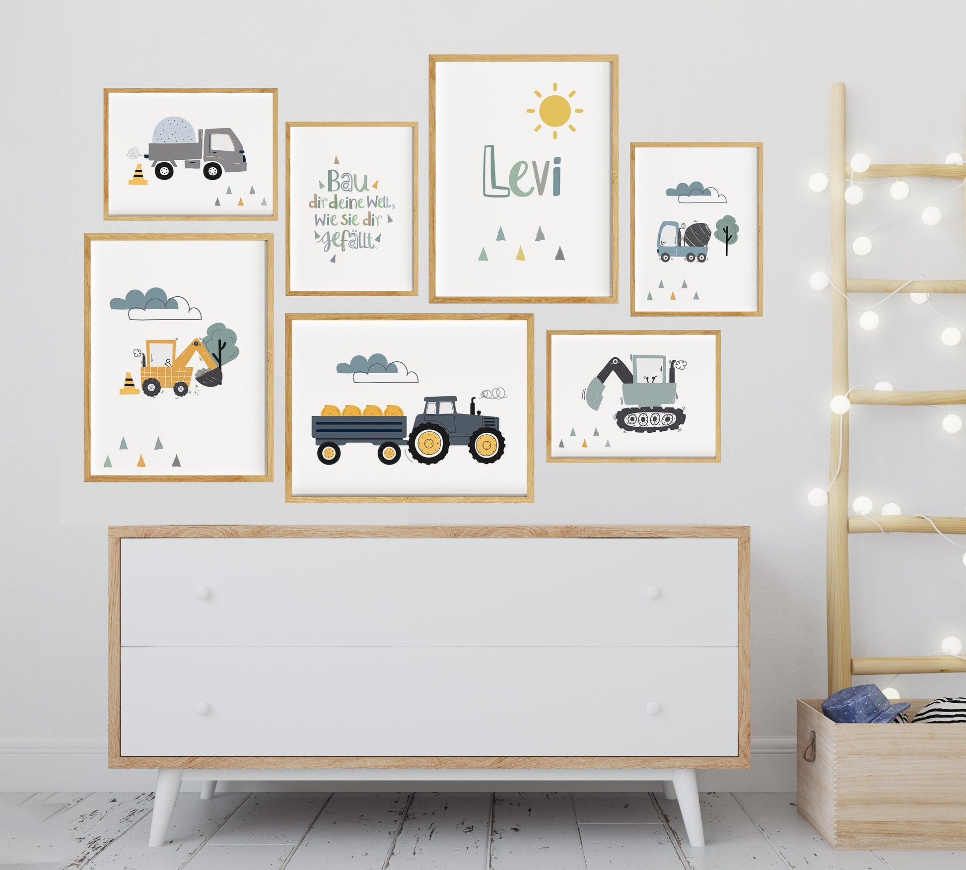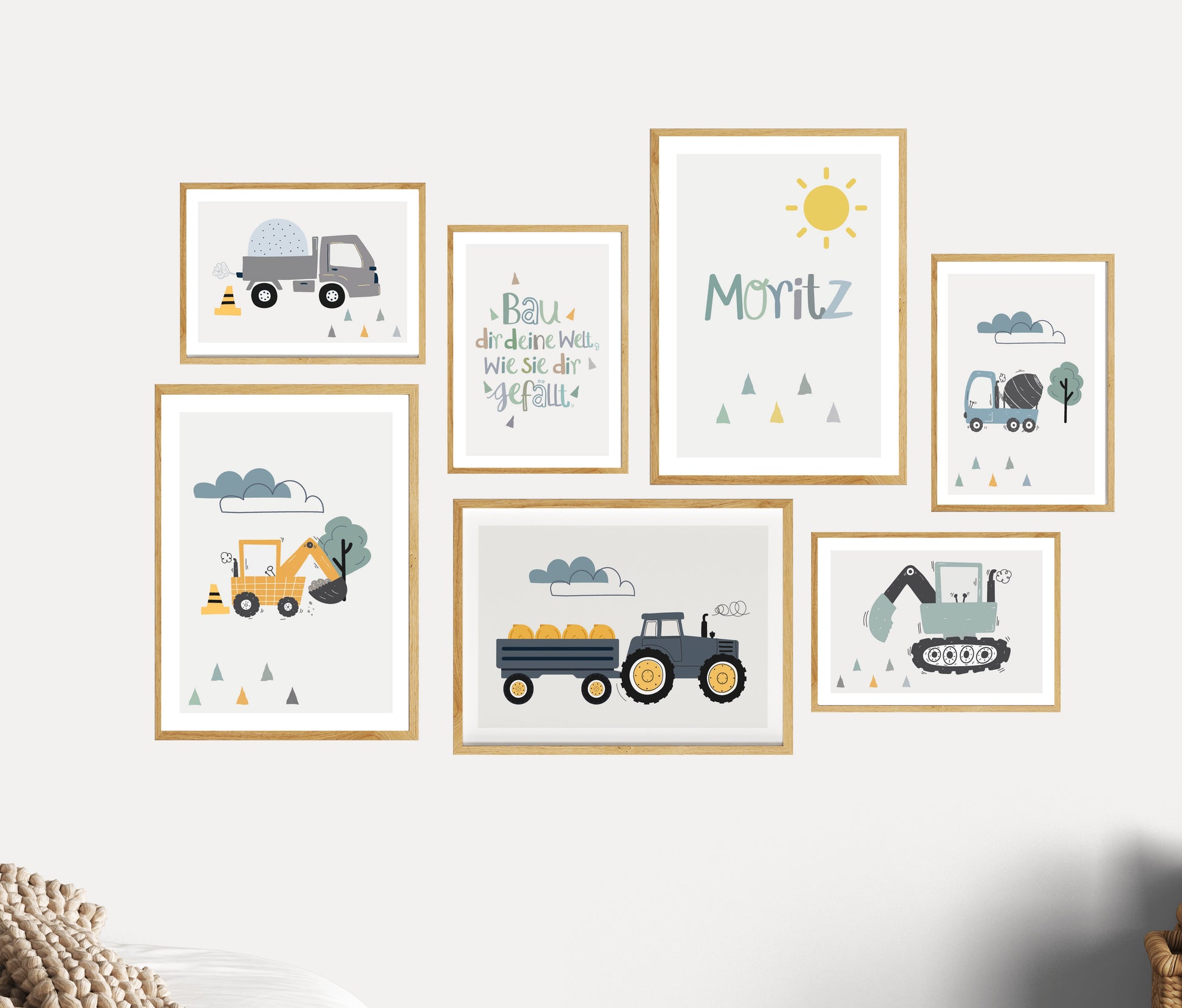 Kinderzimmer 7er Poster Set Collage für Jungen mit personalisiertem Namen als weiße oder graue Wanddeko im Kinderzimmer oder Babyzimmer mit einer Baustelle und Fahrzeugen wie Bagger, Traktor, Betonmischer und einem Kinderspruch mit Namen.