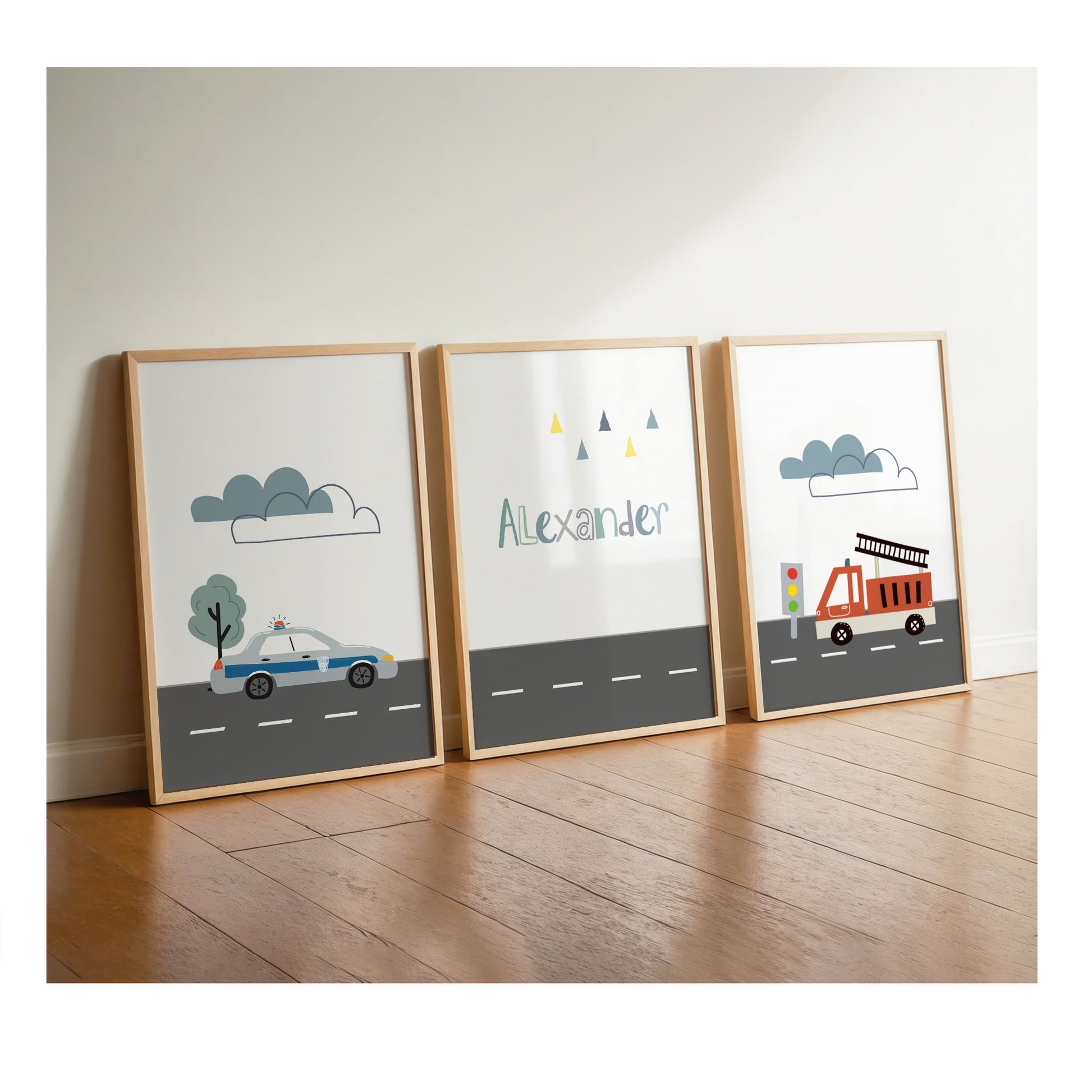 Kinderposter 3er Set für das Jungenzimmer mit eignet sich als graue, blaue, grüne, gelbe und rote Wandgestaltung für das Kinderzimmer, Babyzimmer und Spielzimmer. Eine besondere Geschenkidee für Kinder, Geschwister, Brüder mit einem Polizeiwagen, Namen und einem Feuerwehrwagen.