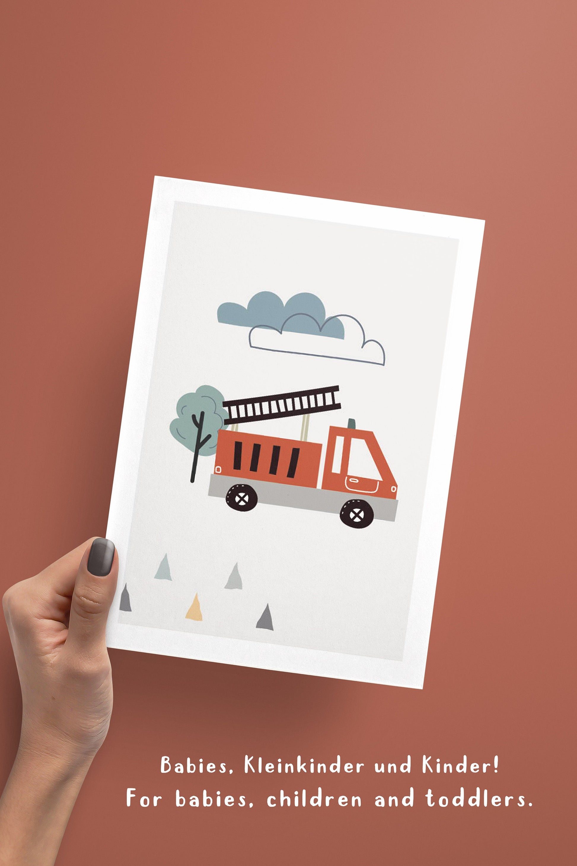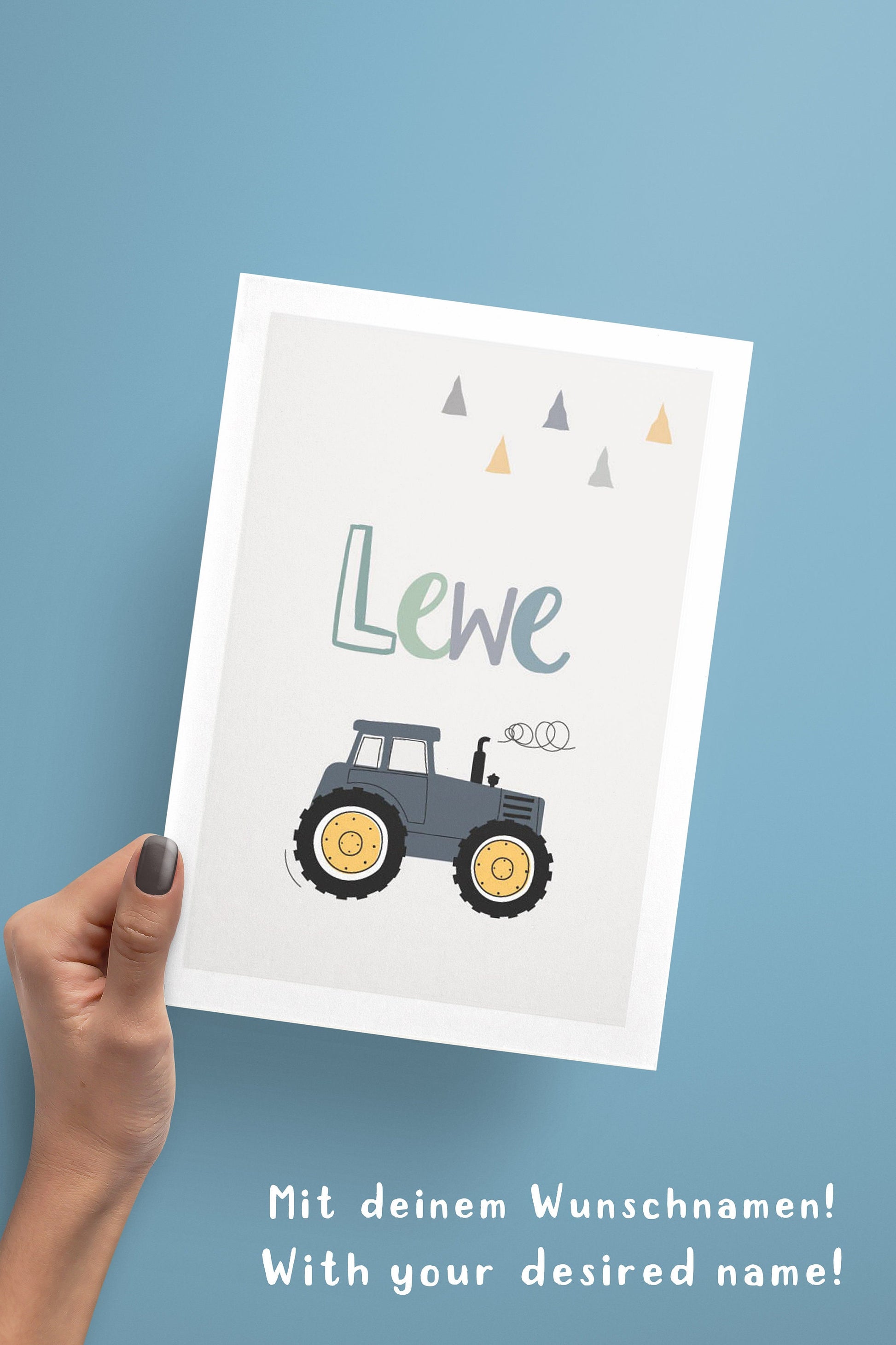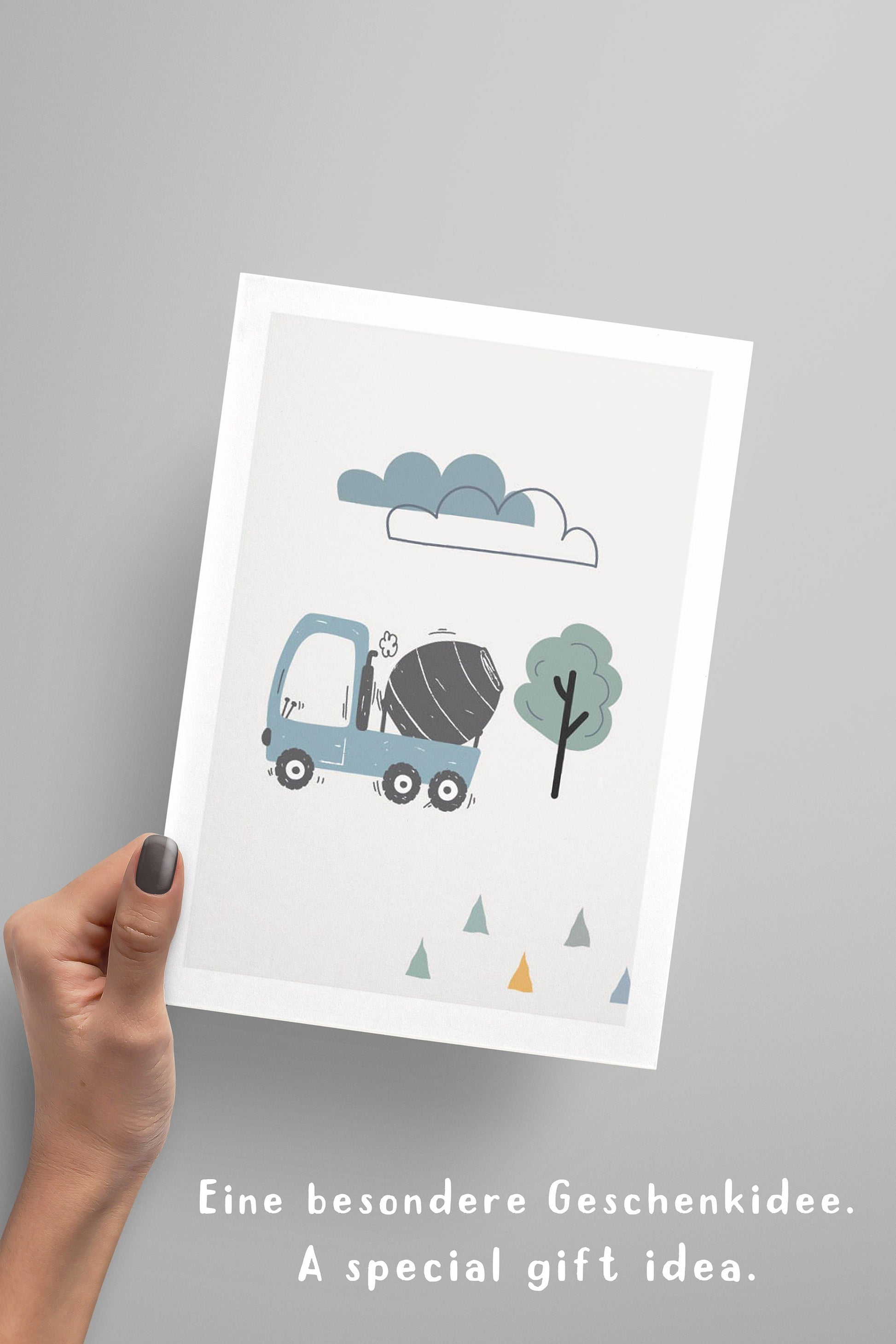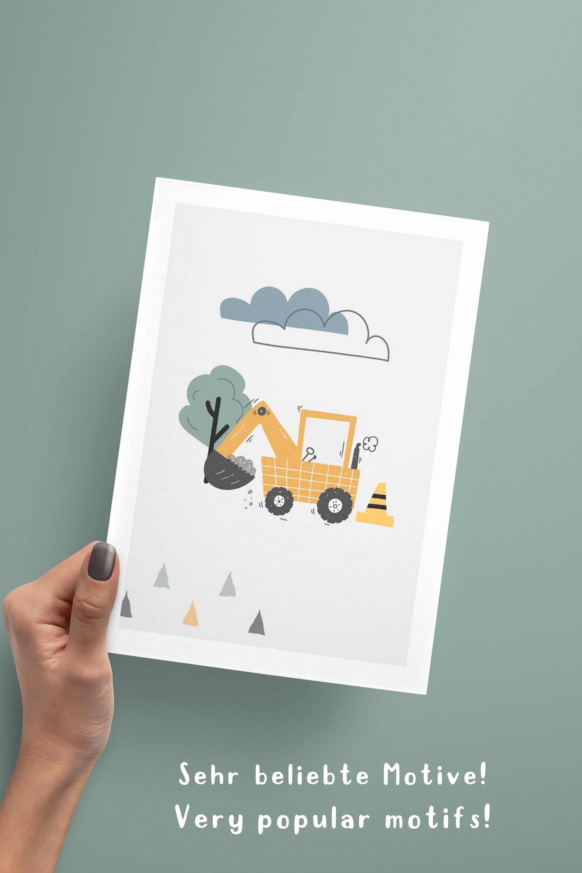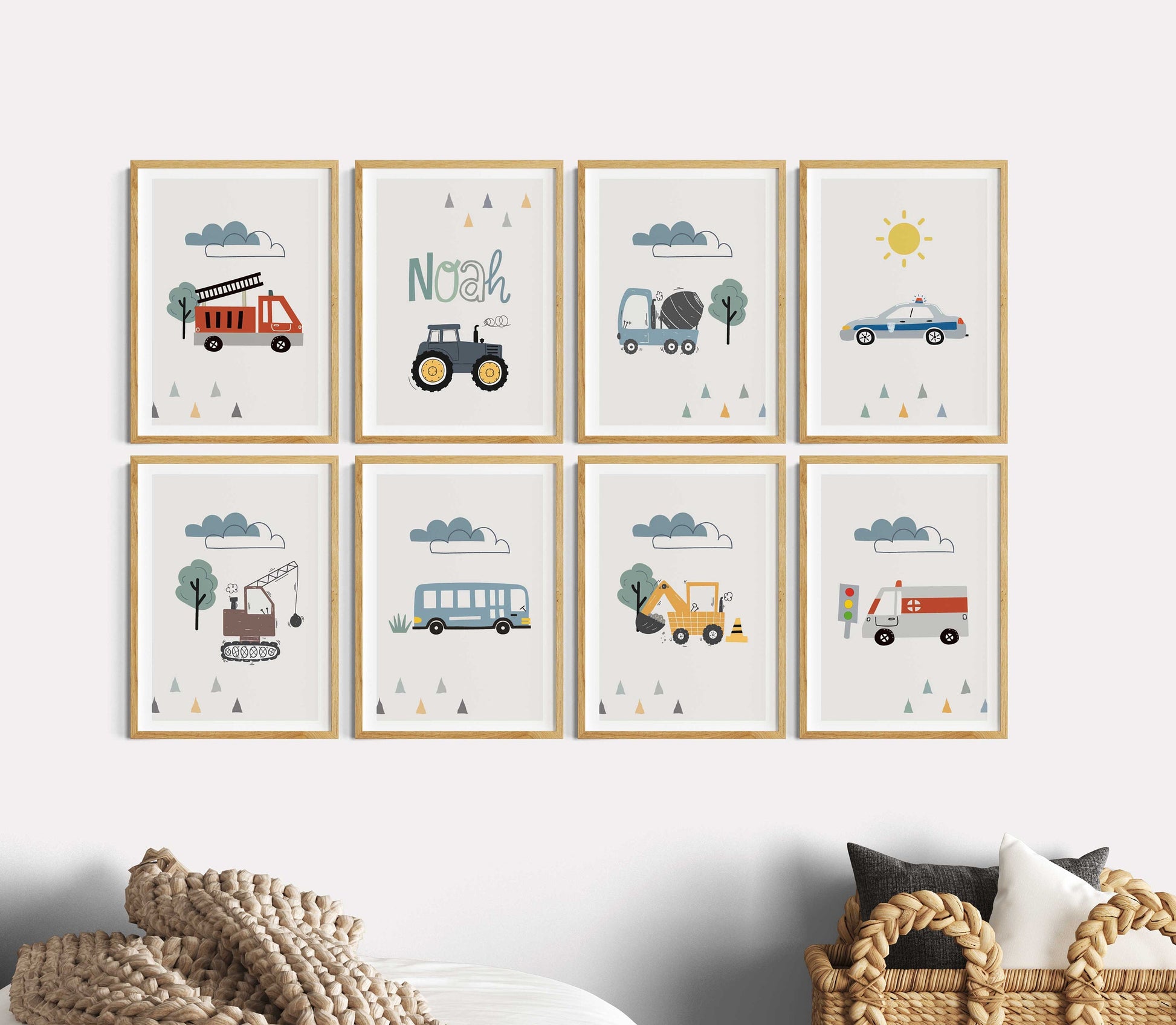 8 Poster als Set mit beliebten Motiven im skandinavischen Stil: Traktor, Feuerwehrwagen, Sonne, Wolken, Betonmischer, Abrissbirne, Polizei Bagger und vieles mehr! Optional mit Namen und einem Kinderspruch auf einem grauen Hintergrund mit einem edlen weißen Rand. Diese Wandbilder eignen sich als Wandgestaltung für das Kinderzimmer, Spielzimmer bzw. Jungenzimmer und auch als Geschenkidee für Kleinkinder und Kinder.