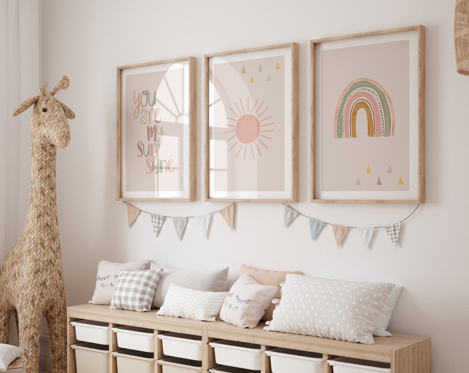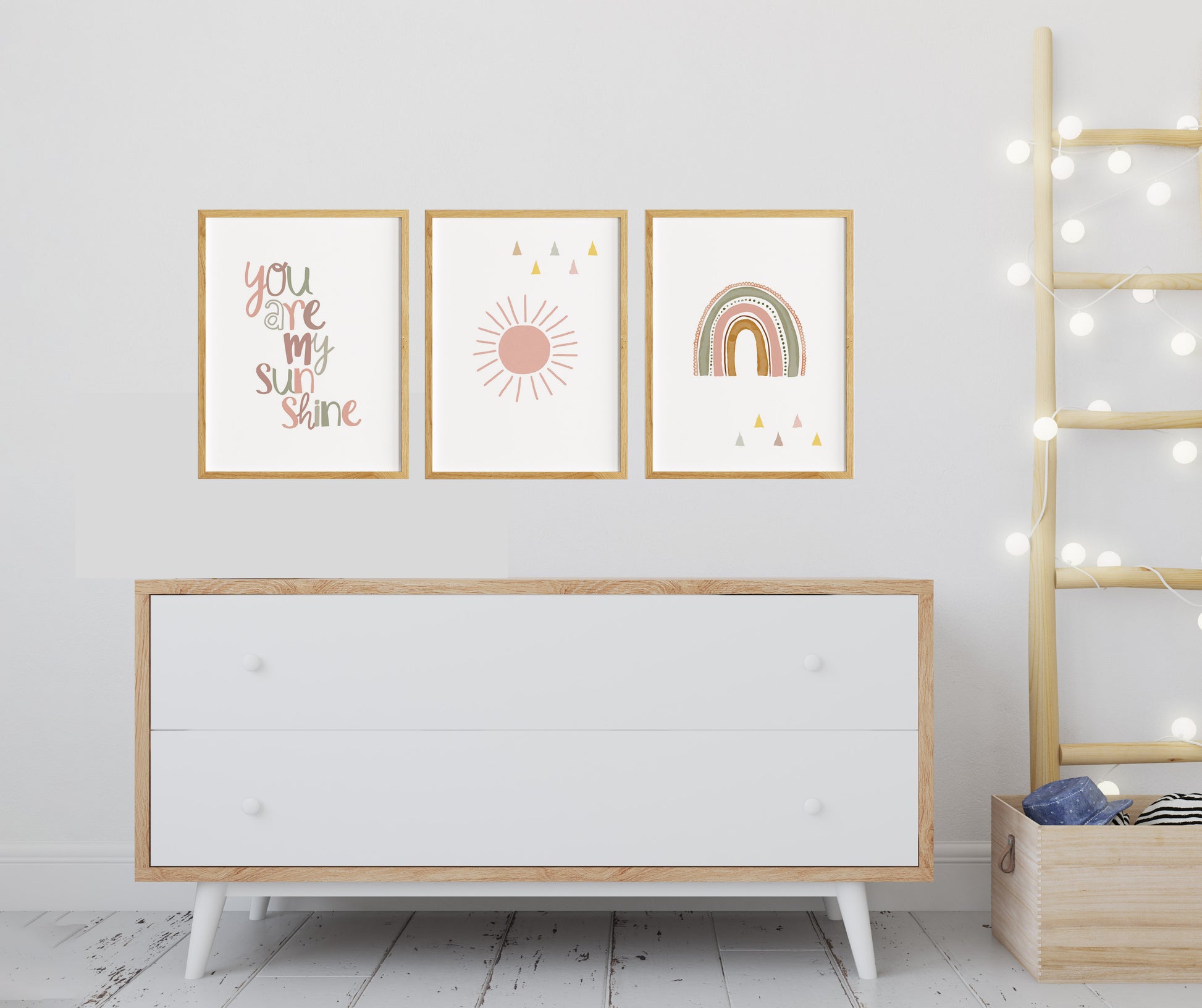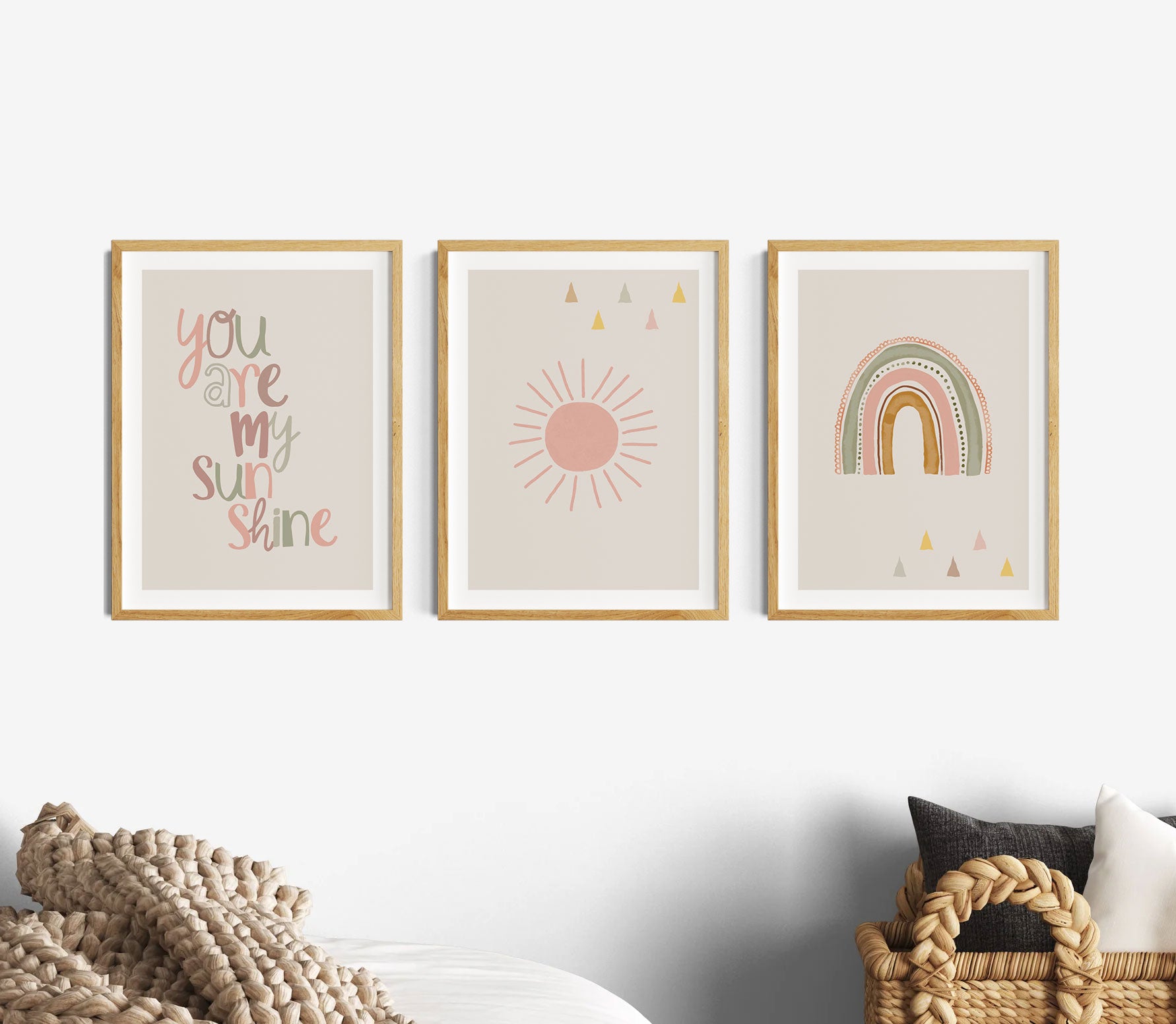Das aquarell altrosa Boho 3er Poster Set für Mädchenzimmer oder Babyzimmer zeigt auf drei Bildern als graue oder beige Wanddeko einen Regenbogen, eine Sonne und den Spruch "You are my sunshine". Diese Wandbilder eignen sich nicht nur als Kinderzimmerdeko, sondern auch als Geschenkidee für Kleinkinder, Kinder, Mädchen, Jugendliche, zur Geburt, Taufe, Schulanfang uvm.